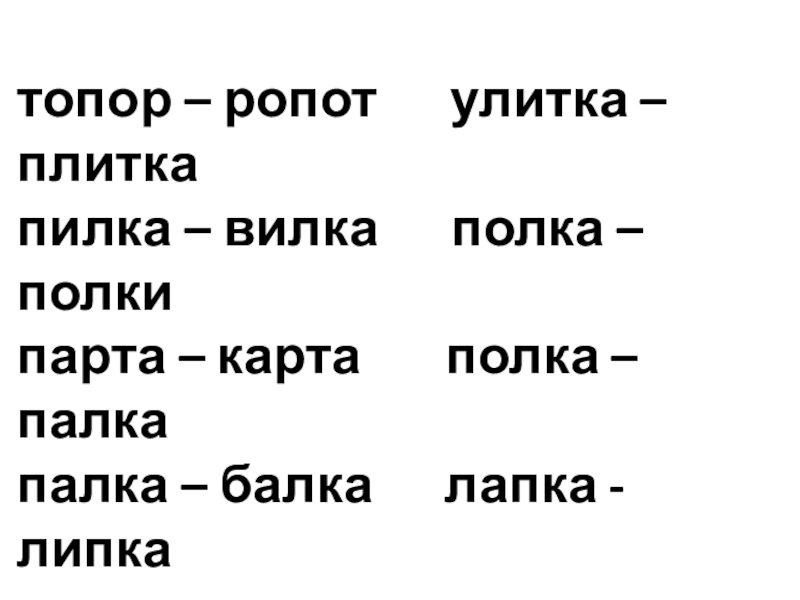топор – ропот   улитка – плиткапилка – вилка   полка – полкипарта – карта