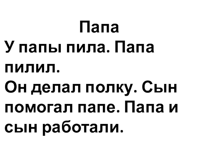 Папа У папы пила. Папа пилил.Он делал полку. Сын помогал папе. Папа и сын работали.