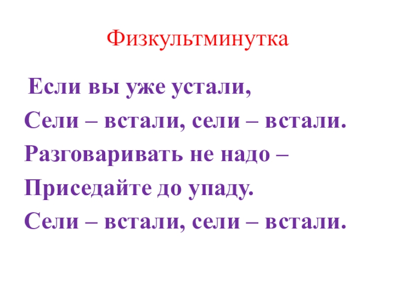 Физкультминутка Если вы уже устали,Сели – встали, сели – встали.Разговаривать не надо – Приседайте до упаду.Сели –