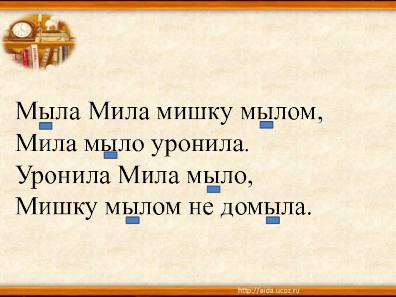 Мыла Мила мишку мылом,Мила мыло уронила.Уронила Мила мыло,Мишку мылом не домыла.