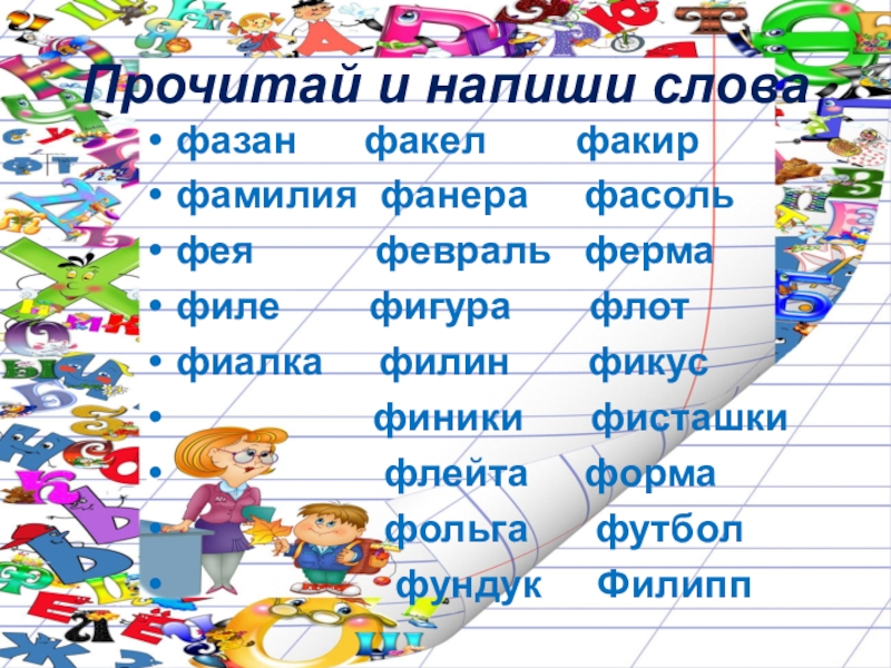 Прочитай и напиши словафазан   факел    факирфамилия фанера   фасольфея