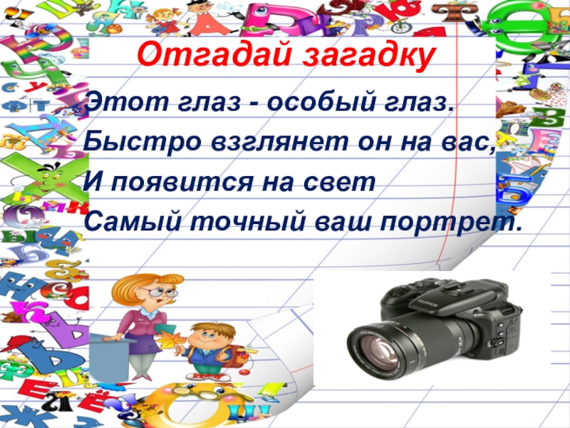 Отгадай загадкуЭтот глаз - особый глаз.Быстро взглянет он на вас,И появится на светСамый точный ваш портрет.