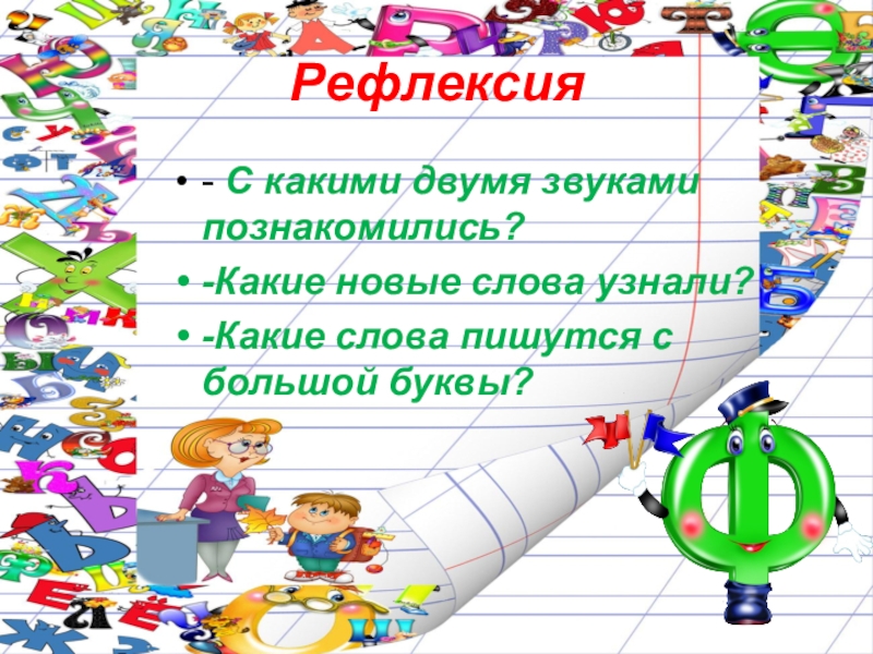 Рефлексия- С какими двумя звуками познакомились?-Какие новые слова узнали?-Какие слова пишутся с большой буквы?