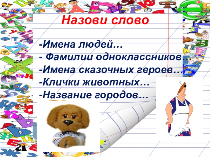Назови словоИмена людей… Фамилии одноклассников…Имена сказочных героев…Клички животных…Название городов…