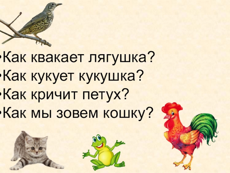 Как квакает лягушка?Как кукует кукушка?Как кричит петух?Как мы зовем кошку?