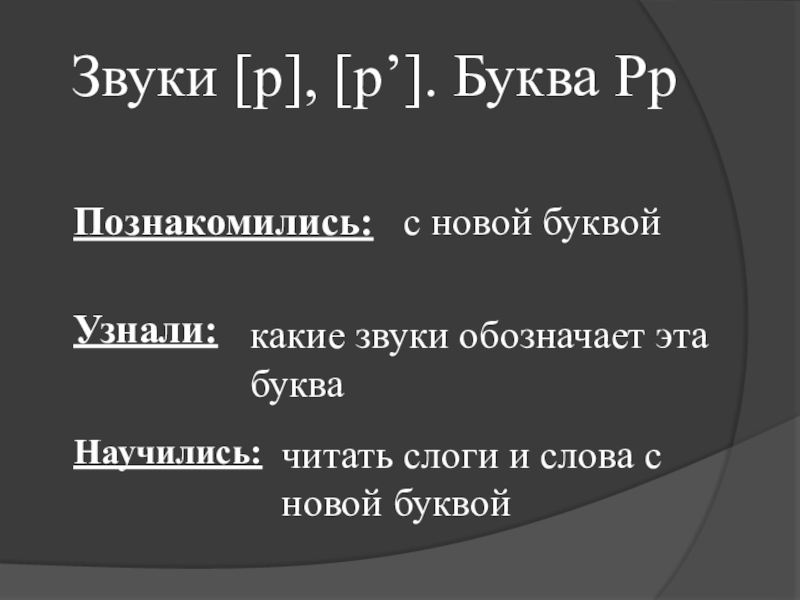 Звуки [р], [р’]. Буква РрПознакомились:Узнали:Научились:с новой буквойкакие звуки обозначает эта буквачитать слоги и слова с новой