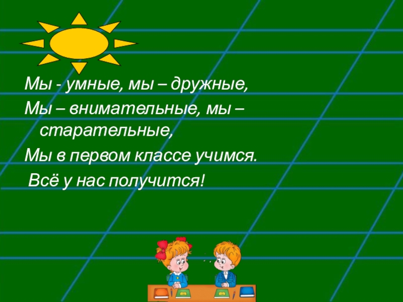 Мы - умные, мы – дружные, Мы – внимательные, мы – старательные, Мы в первом классе учимся. Всё у нас получится!