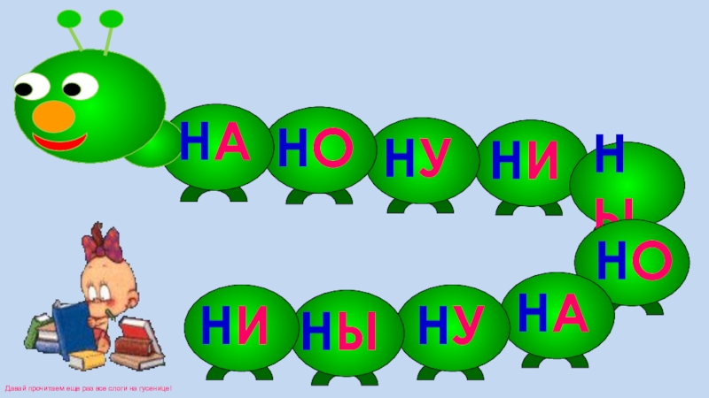 Слайд 34Давай прочитаем еще раз все слоги на гусенице!