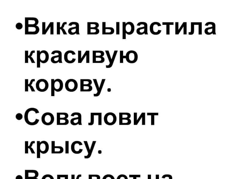 Вика вырастила красивую корову.Сова ловит крысу.Волк воет на луну.