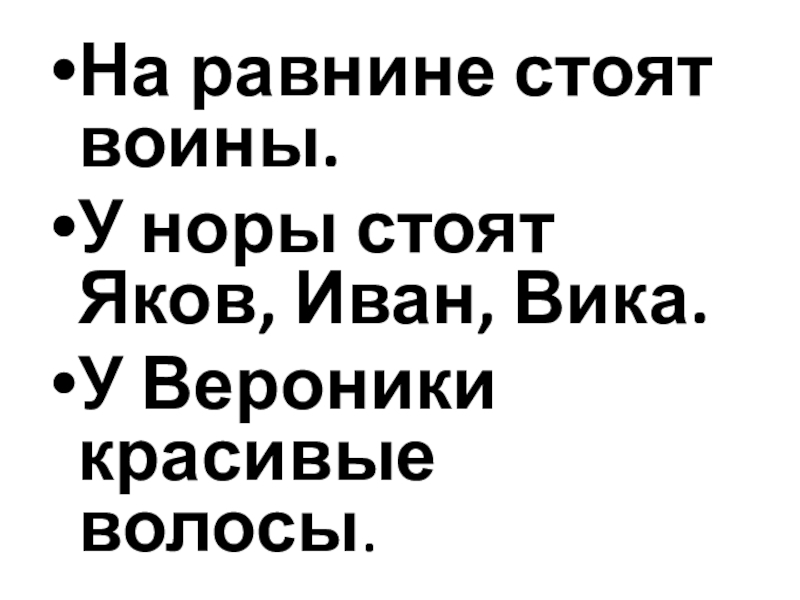 На равнине стоят воины.У норы стоят Яков, Иван, Вика.У Вероники красивые волосы.
