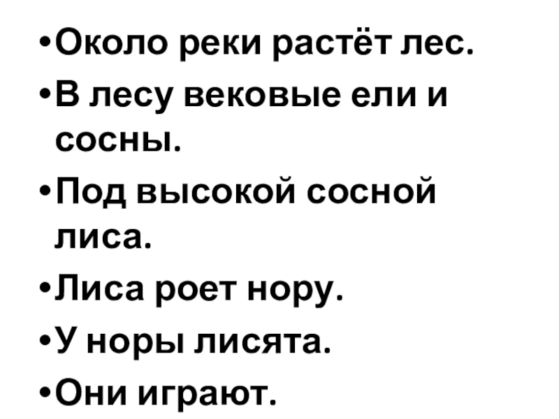 Около реки растёт лес.В лесу вековые ели и сосны.Под высокой сосной лиса.Лиса роет нору.У норы лисята.Они играют.