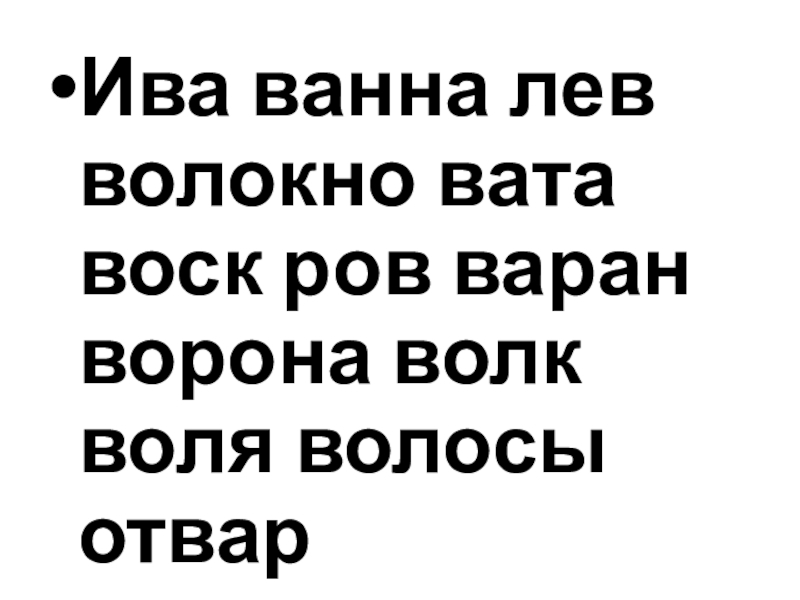 Слайд 5Ива ванна лев волокно вата воск ров варан ворона волк воля
