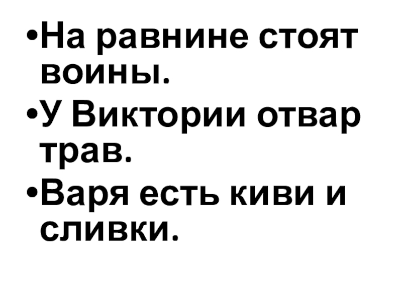 На равнине стоят воины.У Виктории отвар трав.Варя есть киви и сливки.