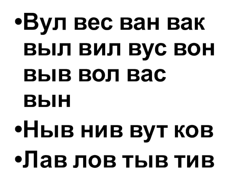 Слайд 3Вул вес ван вак выл вил вус вон выв вол вас