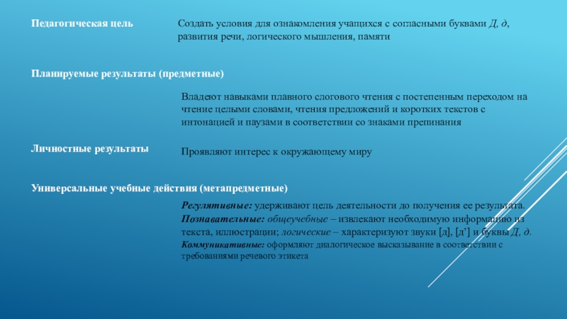 Познавательные: общеучебные – извлекают необходимую информацию из текста, иллюстрации; логические – характеризуют звуки [д], [д’] и буквы Д, д.