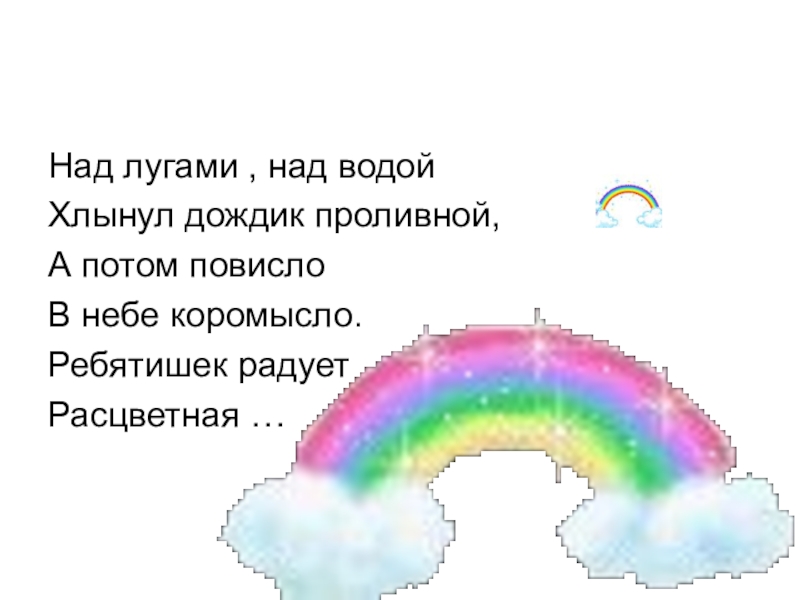 Над лугами , над водойХлынул дождик проливной,А потом повислоВ небе коромысло.Ребятишек радуетРасцветная …