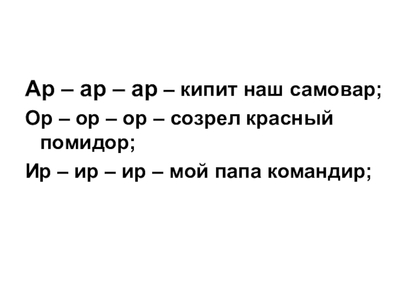 Ар – ар – ар – кипит наш самовар;Ор – ор – ор – созрел красный помидор;Ир