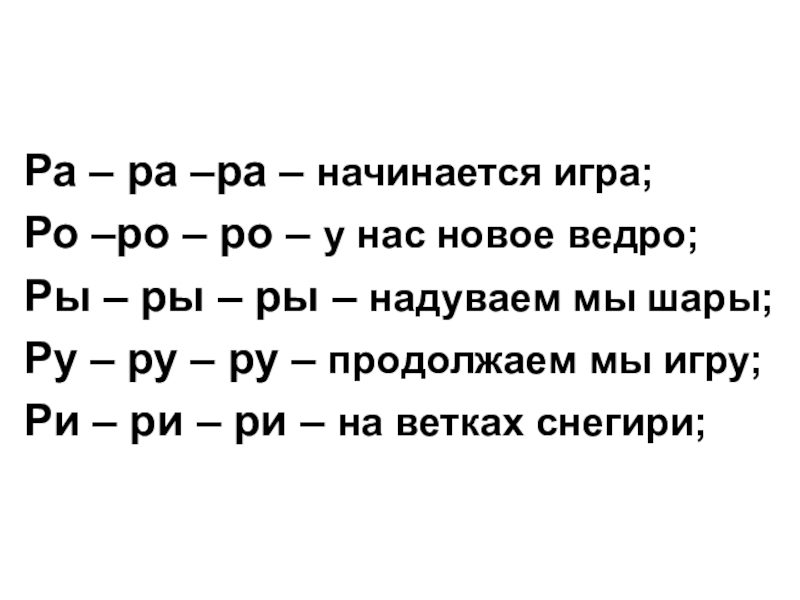 Ра – ра –ра – начинается игра;Ро –ро – ро – у нас новое ведро;Ры – ры