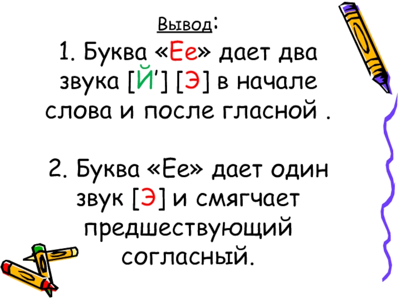 Слайд 7Вывод: 1. Буква «Ее» дает два звука [Й’] [Э] в начале слова