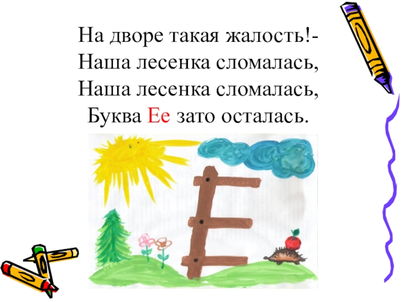На дворе такая жалость!-Наша лесенка сломалась,Наша лесенка сломалась,Буква Ее зато осталась.