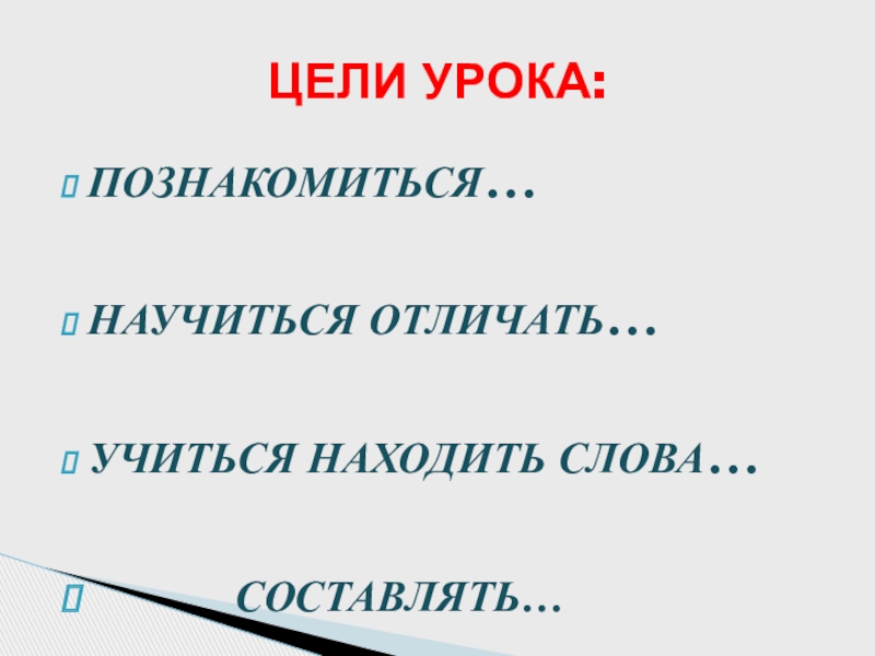 ПОЗНАКОМИТЬСЯ…НАУЧИТЬСЯ ОТЛИЧАТЬ…УЧИТЬСЯ НАХОДИТЬ СЛОВА…      СОСТАВЛЯТЬ…ЦЕЛИ УРОКА: