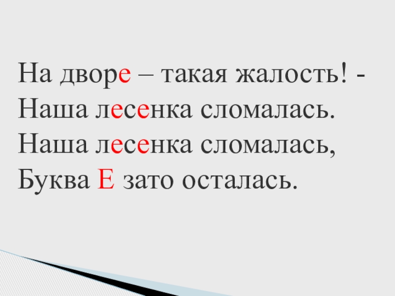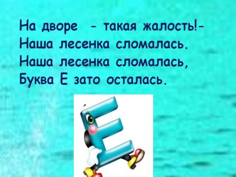 На дворе – такая жалость! -  Наша лесенка сломалась. Наша лесенка сломалась, Буква Е зато осталась.