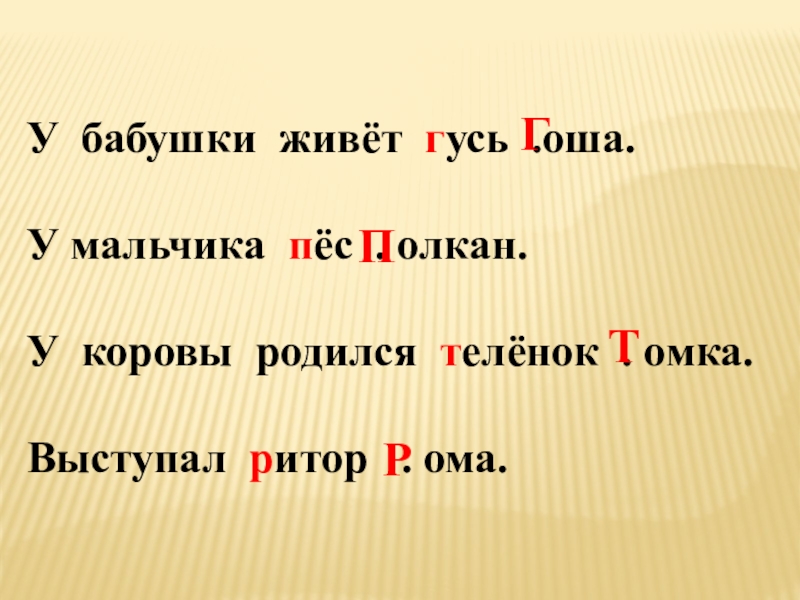 У бабушки живёт гусь .оша.У мальчика пёс . олкан. У коровы родился телёнок . омка.Выступал ритор