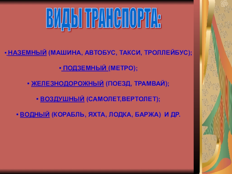 ВИДЫ ТРАНСПОРТА: НАЗЕМНЫЙ (МАШИНА, АВТОБУС, ТАКСИ, ТРОЛЛЕЙБУС); ПОДЗЕМНЫЙ (МЕТРО); ЖЕЛЕЗНОДОРОЖНЫЙ (ПОЕЗД, ТРАМВАЙ); ВОЗДУШНЫЙ (САМОЛЕТ,ВЕРТОЛЕТ); ВОДНЫЙ (КОРАБЛЬ, ЯХТА, ЛОДКА, БАРЖА) И ДР.