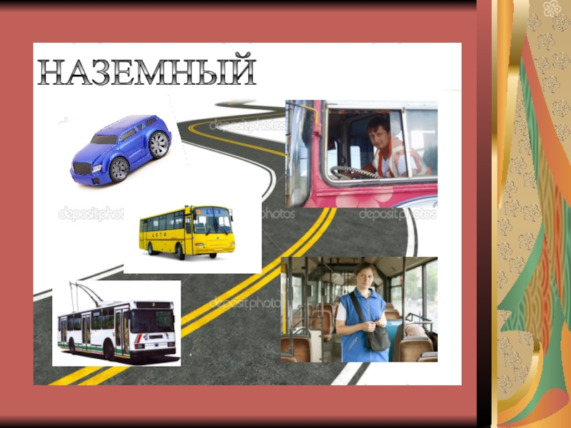 ВИДЫ ТРАНСПОРТА: НАЗЕМНЫЙ (МАШИНА, АВТОБУС, ТАКСИ, ТРОЛЛЕЙБУС); ПОДЗЕМНЫЙ (МЕТРО); ЖЕЛЕЗНОДОРОЖНЫЙ (ПОЕЗД, ТРАМВАЙ); ВОЗДУШНЫЙ (САМОЛЕТ,ВЕРТОЛЕТ); ВОДНЫЙ (КОРАБЛЬ, ЯХТА,