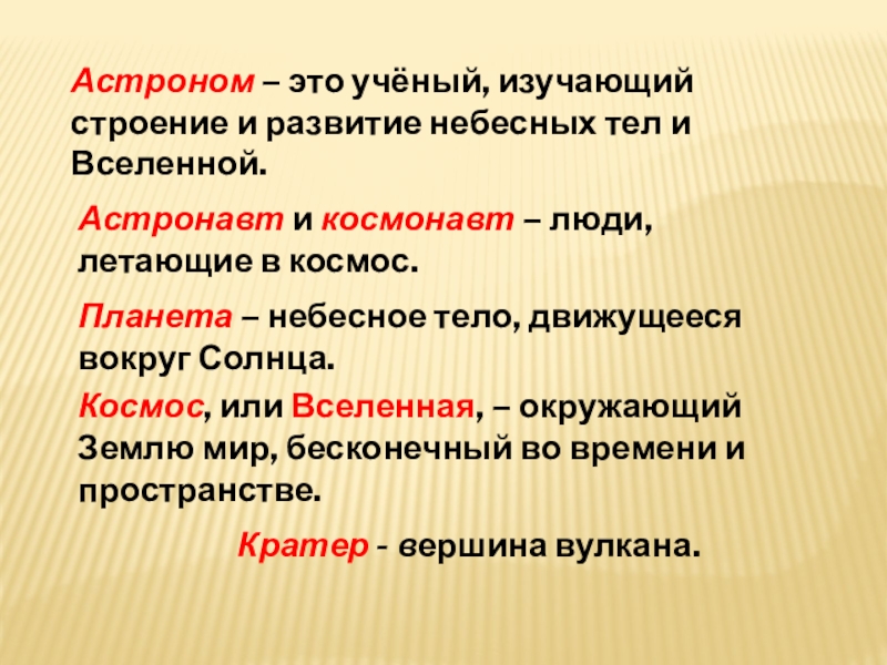 Космос, или Вселенная, – окружающий Землю мир, бесконечный во времени и пространстве.