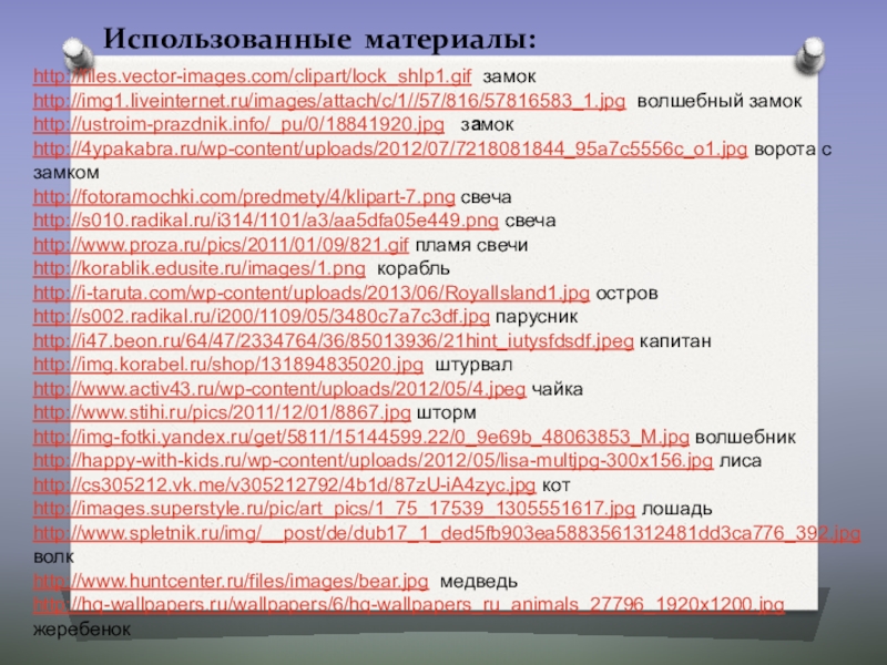 Использованные материалы:http://files.vector-images.com/clipart/lock_shlp1.gif замокhttp://img1.liveinternet.ru/images/attach/c/1//57/816/57816583_1.jpg волшебный замокhttp://ustroim-prazdnik.info/_pu/0/18841920.jpg  замокhttp://4ypakabra.ru/wp-content/uploads/2012/07/7218081844_95a7c5556c_o1.jpg ворота с замкомhttp://fotoramochki.com/predmety/4/klipart-7.png свечаhttp://s010.radikal.ru/i314/1101/a3/aa5dfa05e449.png свечаhttp://www.proza.ru/pics/2011/01/09/821.gif пламя свечиhttp://korablik.edusite.ru/images/1.png корабльhttp://i-taruta.com/wp-content/uploads/2013/06/RoyalIsland1.jpg островhttp://s002.radikal.ru/i200/1109/05/3480c7a7c3df.jpg парусникhttp://i47.beon.ru/64/47/2334764/36/85013936/21hint_iutysfdsdf.jpeg