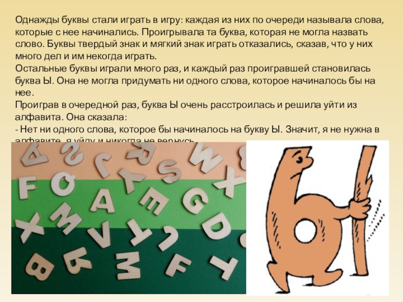 Остальные буквы играли много раз, и каждый раз проигравшей становилась буква Ы. Она не могла придумать ни одного слова, которое начиналось бы на нее.