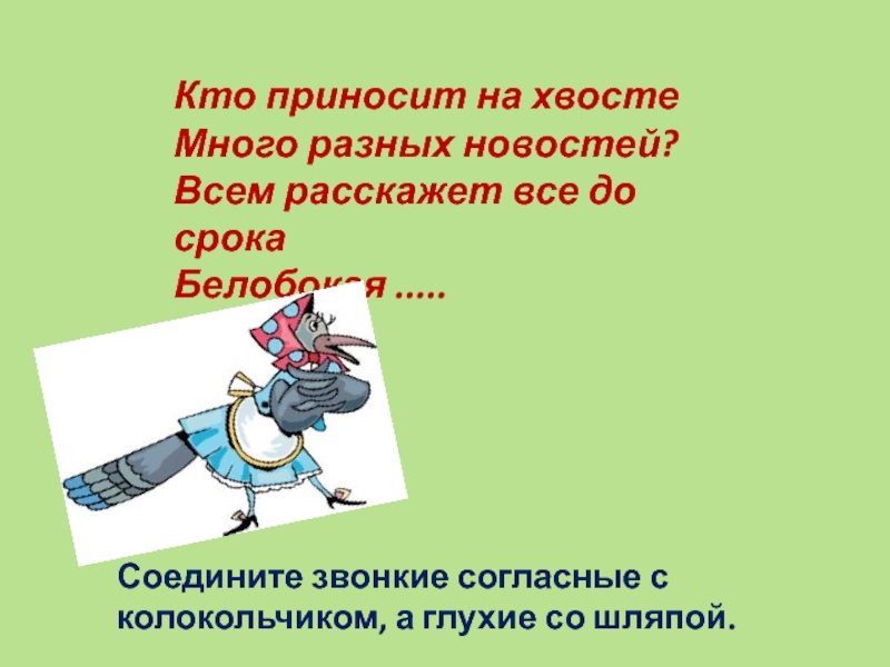 Кто приносит на хвосте  Много разных новостей? Всем расскажет все до срока Белобокая .....Соедините звонкие согласные с колокольчиком, а глухие со шляпой.