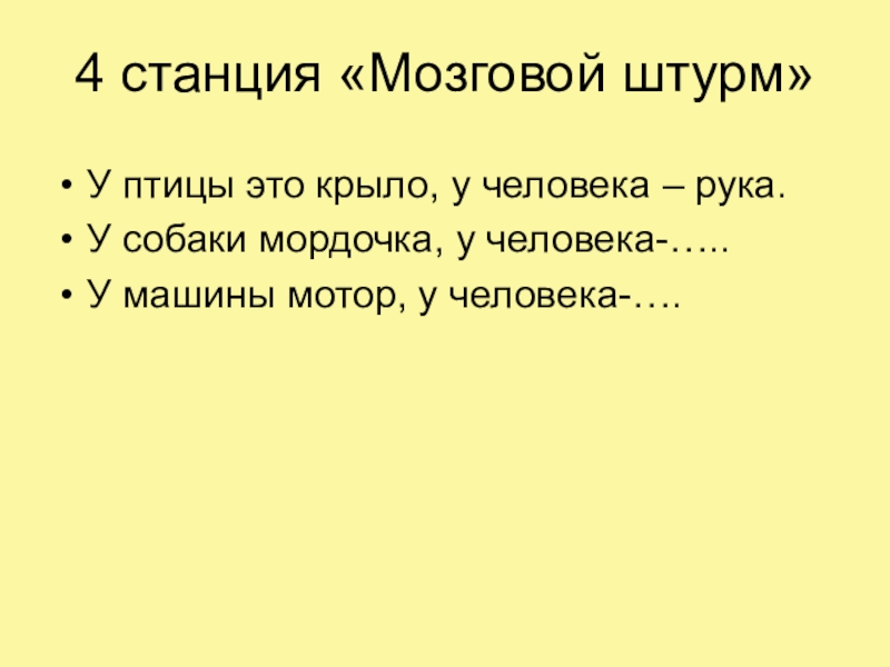 4 станция «Мозговой штурм»У птицы это крыло, у человека – рука.У собаки мордочка, у человека-…..У машины мотор,