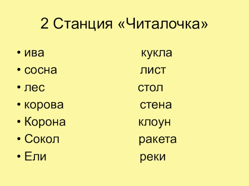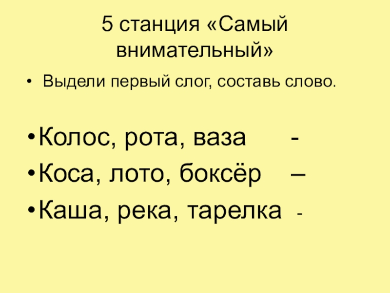 5 станция «Самый внимательный» Выдели первый слог, составь слово.Колос, рота, ваза   -Коса, лото, боксёр