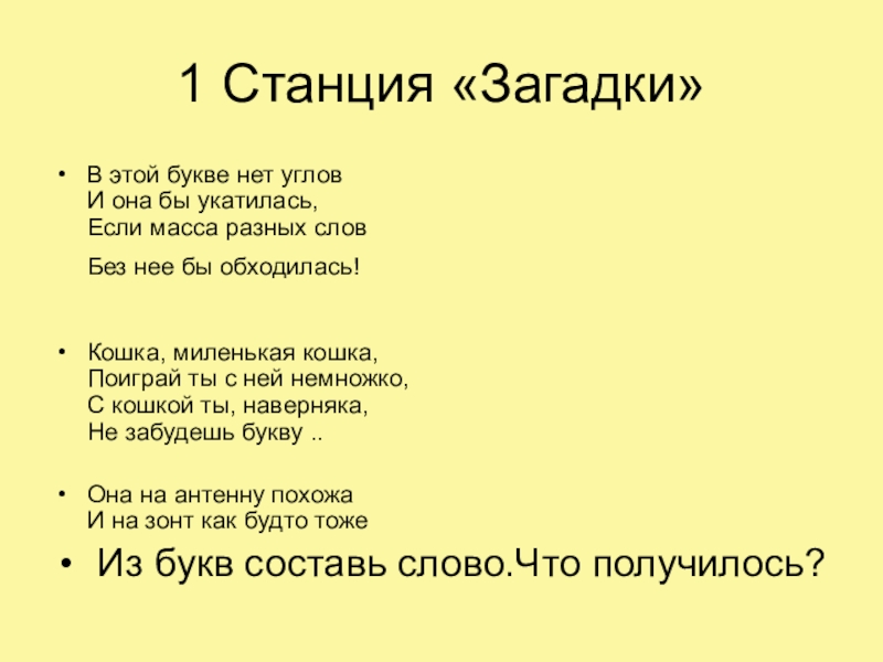 1 Станция «Загадки»В этой букве нет углов И она бы укатилась, Если масса разных слов Без нее бы обходилась! Кошка, миленькая кошка,  Поиграй ты с ней немножко, С кошкой ты, наверняка, Не забудешь букву .. Она