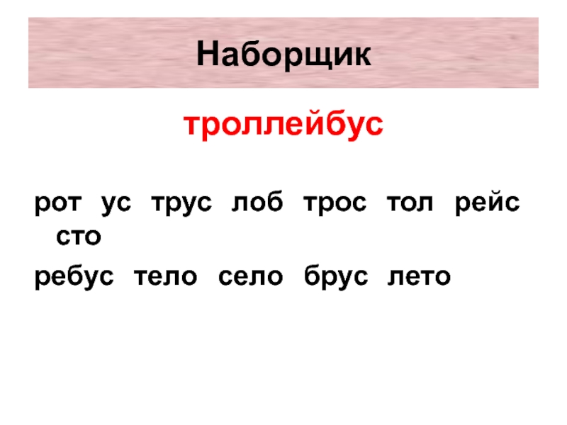 Наборщиктроллейбусрот  ус  трус  лоб  трос  тол  рейс  сторебус  тело
