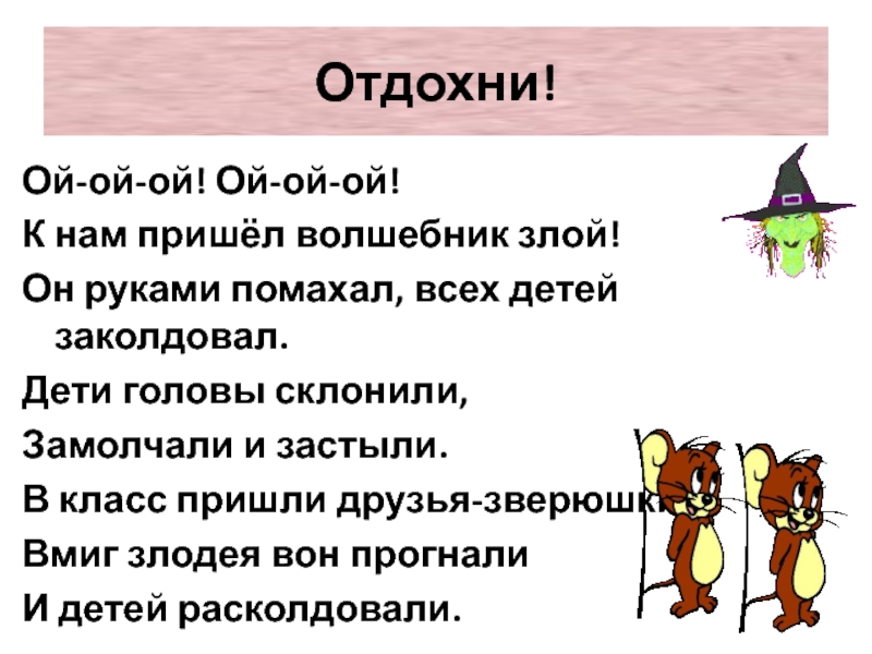 Отдохни!Ой-ой-ой! Ой-ой-ой!К нам пришёл волшебник злой!Он руками помахал, всех детей заколдовал.Дети головы склонили,Замолчали и застыли.В класс пришли