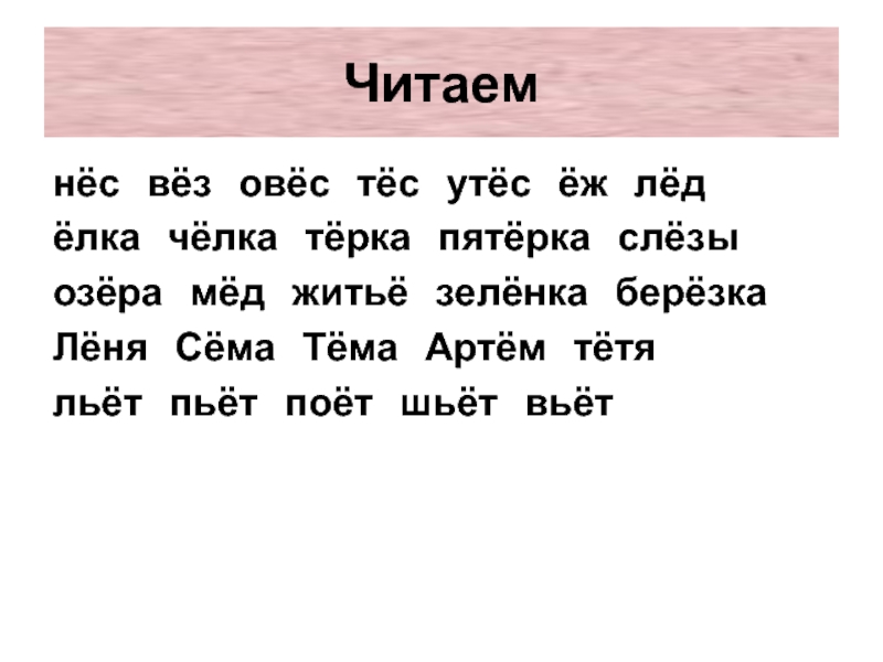 Читаемнёс вёз овёс тёс утёс ёж лёдёлка чёлка тёрка пятёрка слёзыозёра мёд житьё зелёнка берёзкаЛёня Сёма Тёма Артём