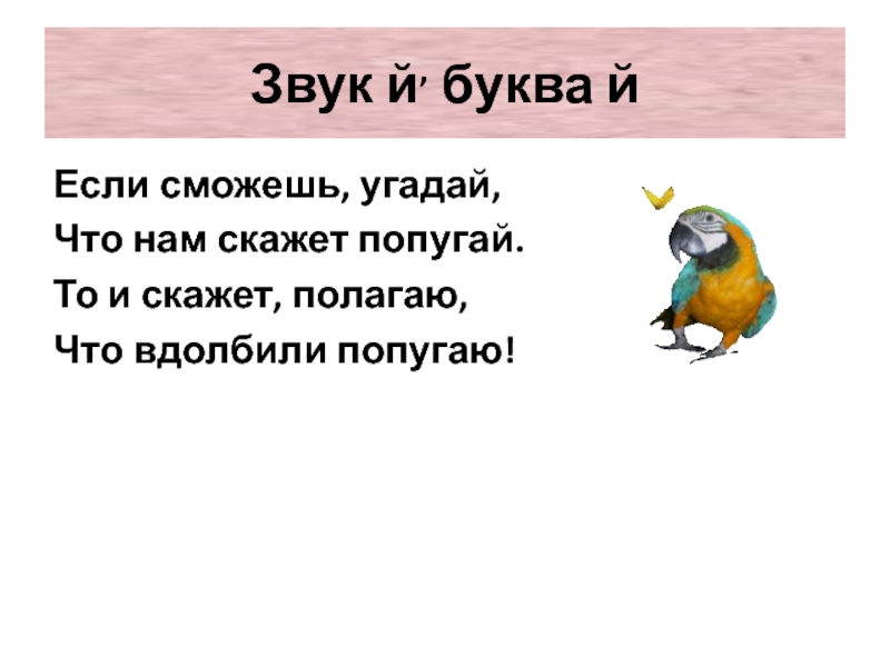 Звук й, буква йЕсли сможешь, угадай,Что нам скажет попугай.То и скажет, полагаю,Что вдолбили попугаю!