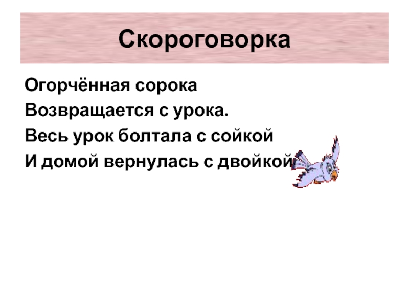 СкороговоркаОгорчённая сорокаВозвращается с урока.Весь урок болтала с сойкойИ домой вернулась с двойкой.