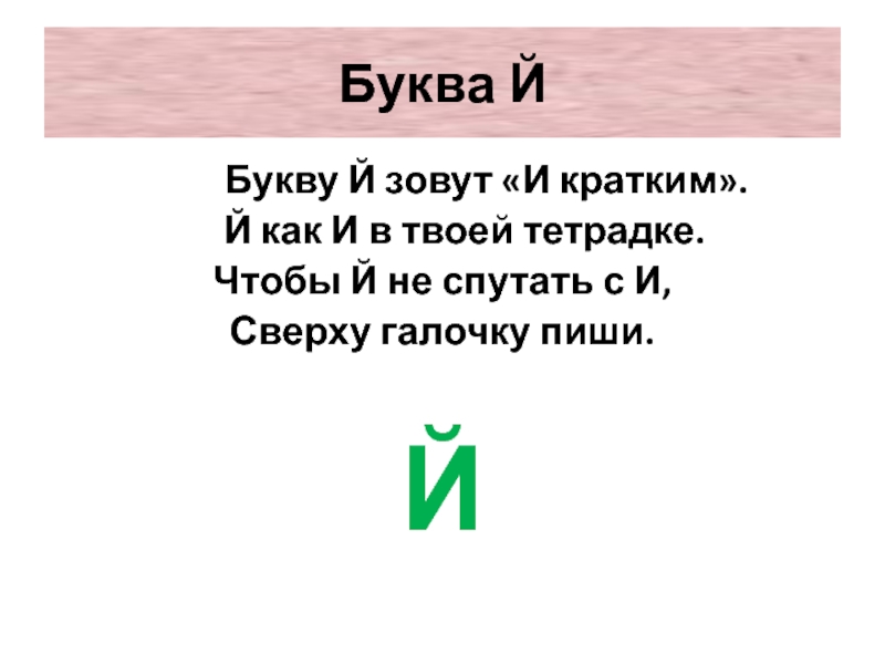 Буква Й		Букву Й зовут «И кратким».	Й как И в твоей тетрадке.Чтобы Й не спутать с И,Сверху галочку