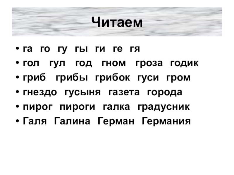 Читаемга  го  гу  гы  ги  ге  гягол  гул  год