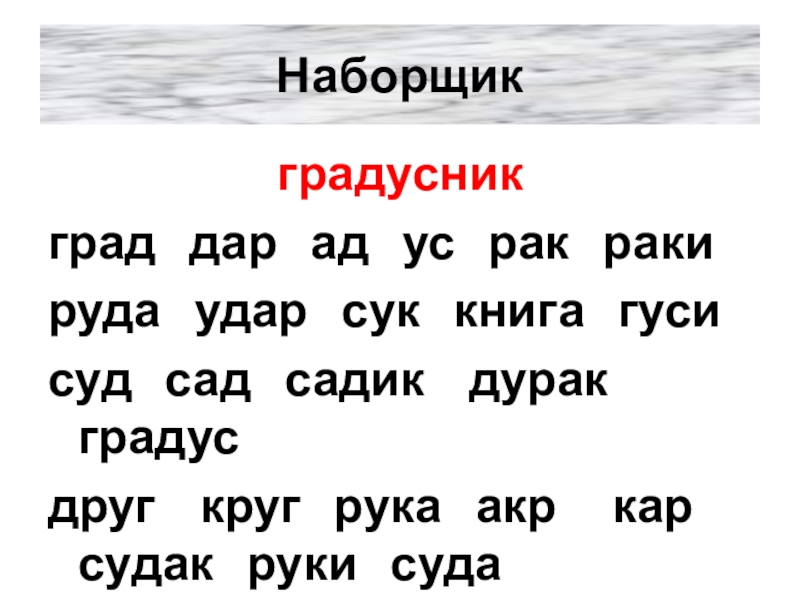 Наборщикградусникград  дар  ад  ус  рак  ракируда  удар  сук  книга