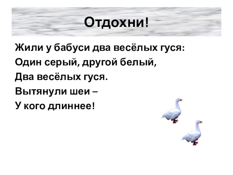 Отдохни!Жили у бабуси два весёлых гуся:Один серый, другой белый,Два весёлых гуся.Вытянули шеи – У кого длиннее!