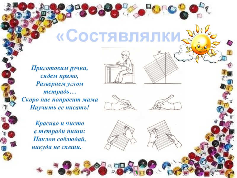 «Состявлялкин»Приготовим ручки, сядем прямо,Развернем углом тетрадь…Скоро нас попросит мамаНаучить ее писать! Красиво и чисто в тетради пиши:Наклон
