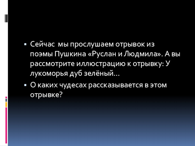 Слайд 22Сейчас мы прослушаем отрывок из поэмы Пушкина «Руслан и Людмила». А вы