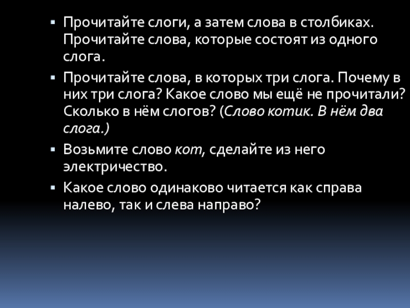 Прочитайте слова, в которых три слога. Почему в них три слога? Какое слово мы ещё не прочитали? Сколько в нём слогов? (Слово котик. В нём два слога.)