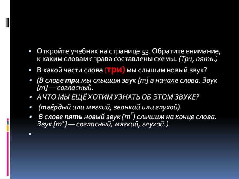 (В слове три мы слышим звук [т] в начале слова. Звук [т] — согласный.