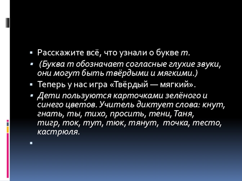 Дети пользуются карточками зелёного и синего цветов. Учитель диктует слова: кнут, гнать, ты, тихо, просить, тени, Таня, тигр, ток, тут, тюк, тянут, точка, тесто, кастрюля.